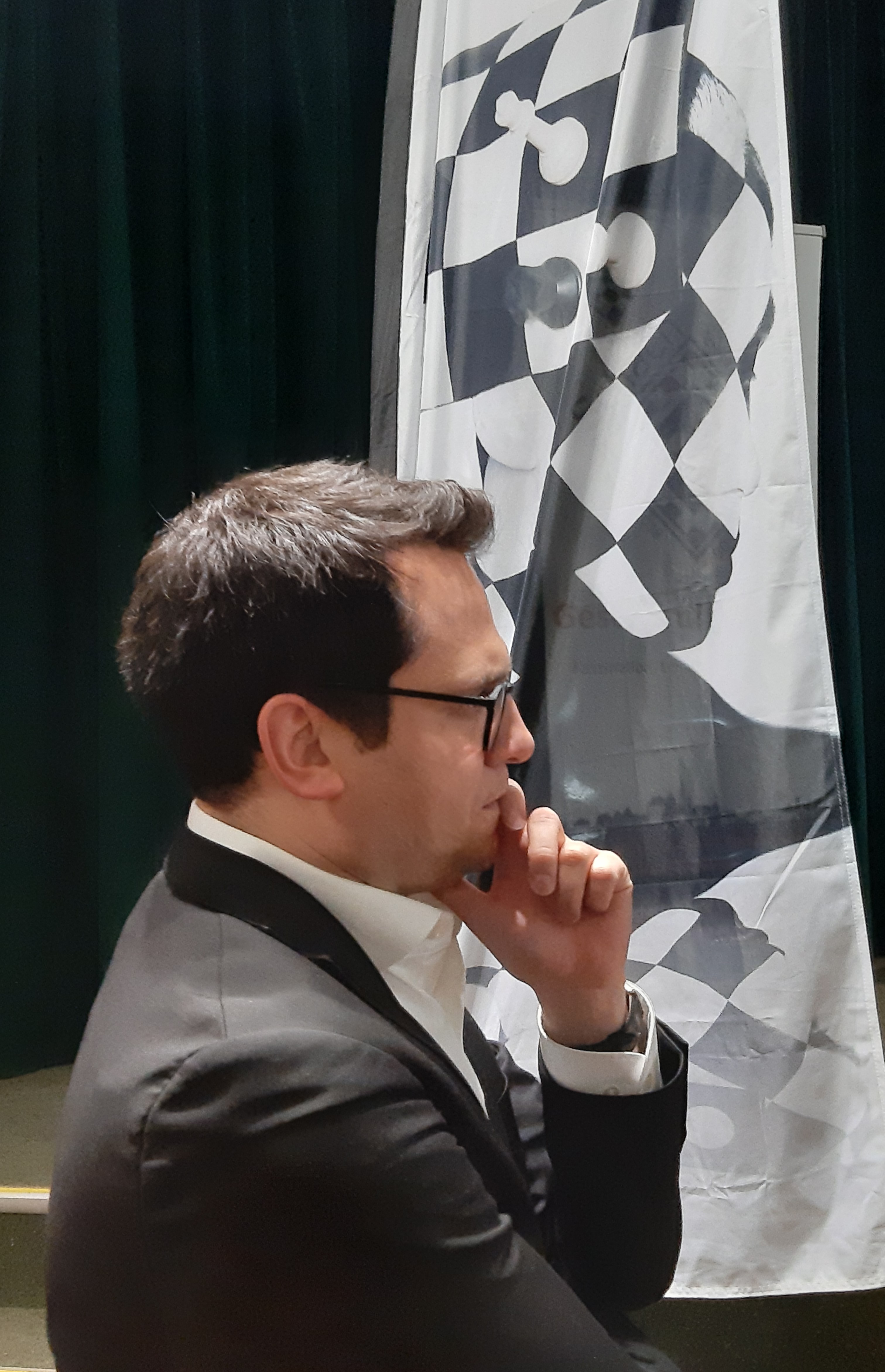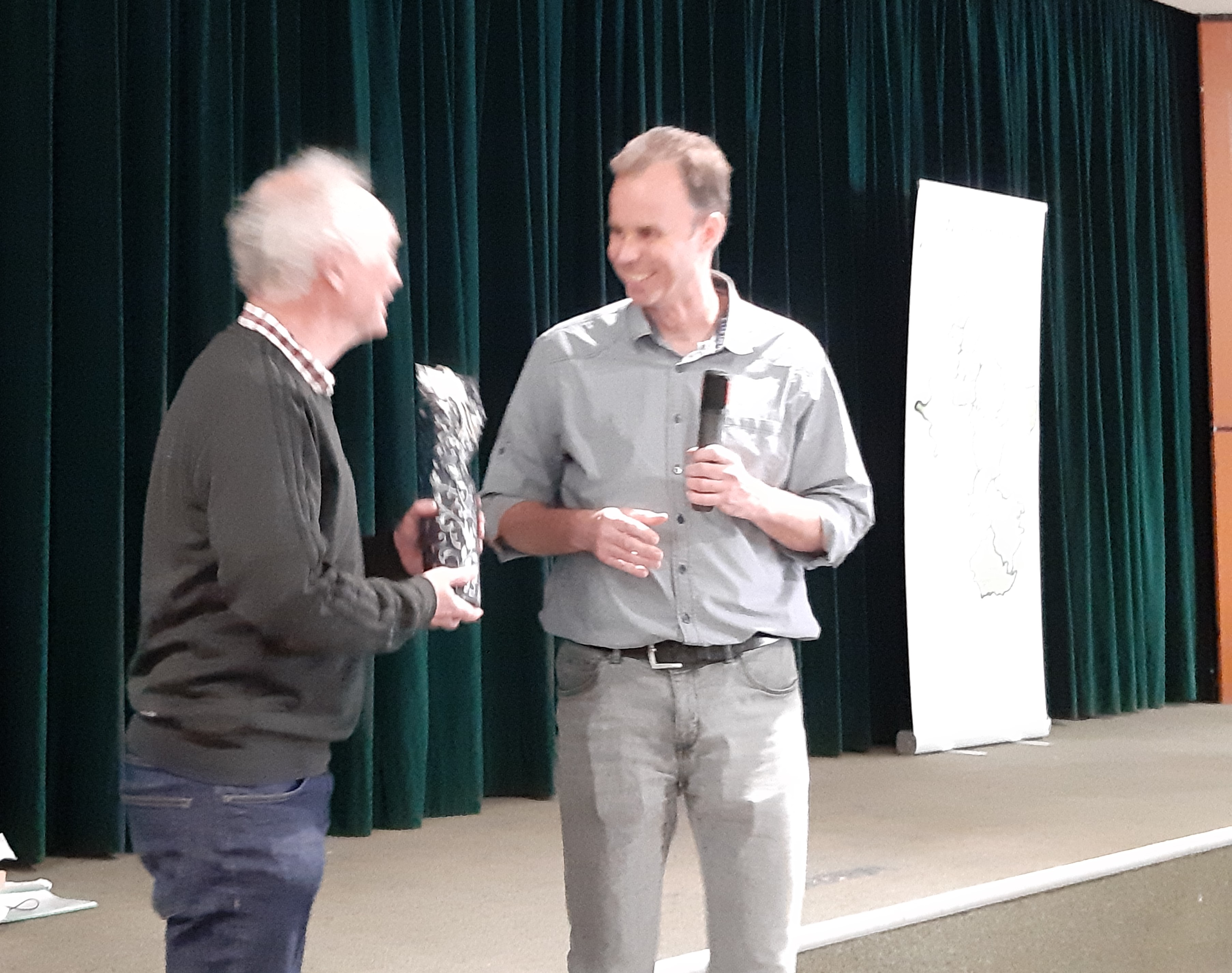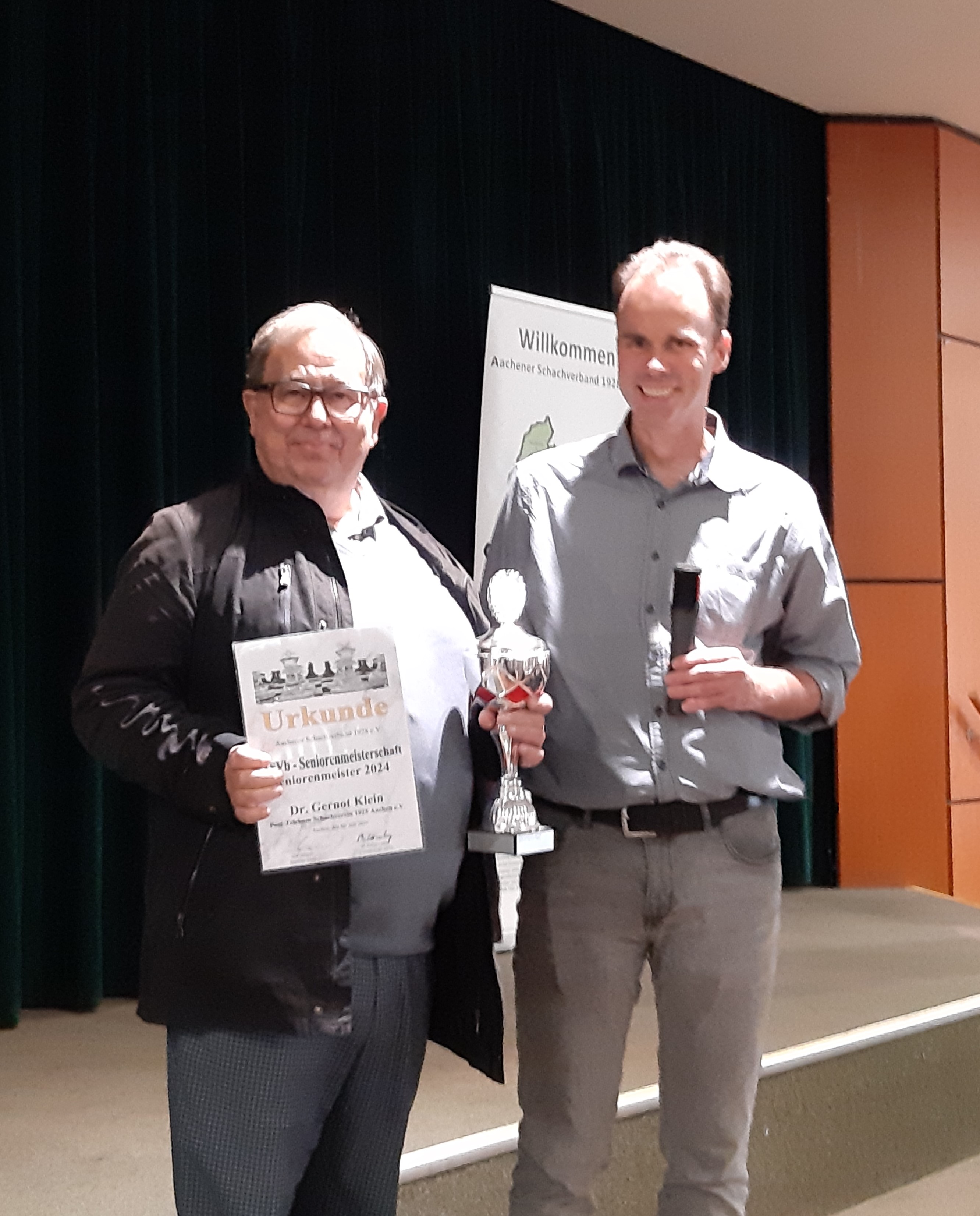 Bevor die Bretter aber frei gegeben wurden nutzte der Vorsitzende Philipp Lamby die Gelegenheit, um vor großem Publikum noch Danke zu sagen und zwei Ehrungen vorzunehmen. Philipp bedankte sich mit einem kleinem Präsent und warmen Worten für den aus dem Vorstand des ASVb ausgeschiedenen DWZ Referenten Ronald Hetfeld. Ronald hatte dieses Amt mehr als 25 Jahre ausgeführt.