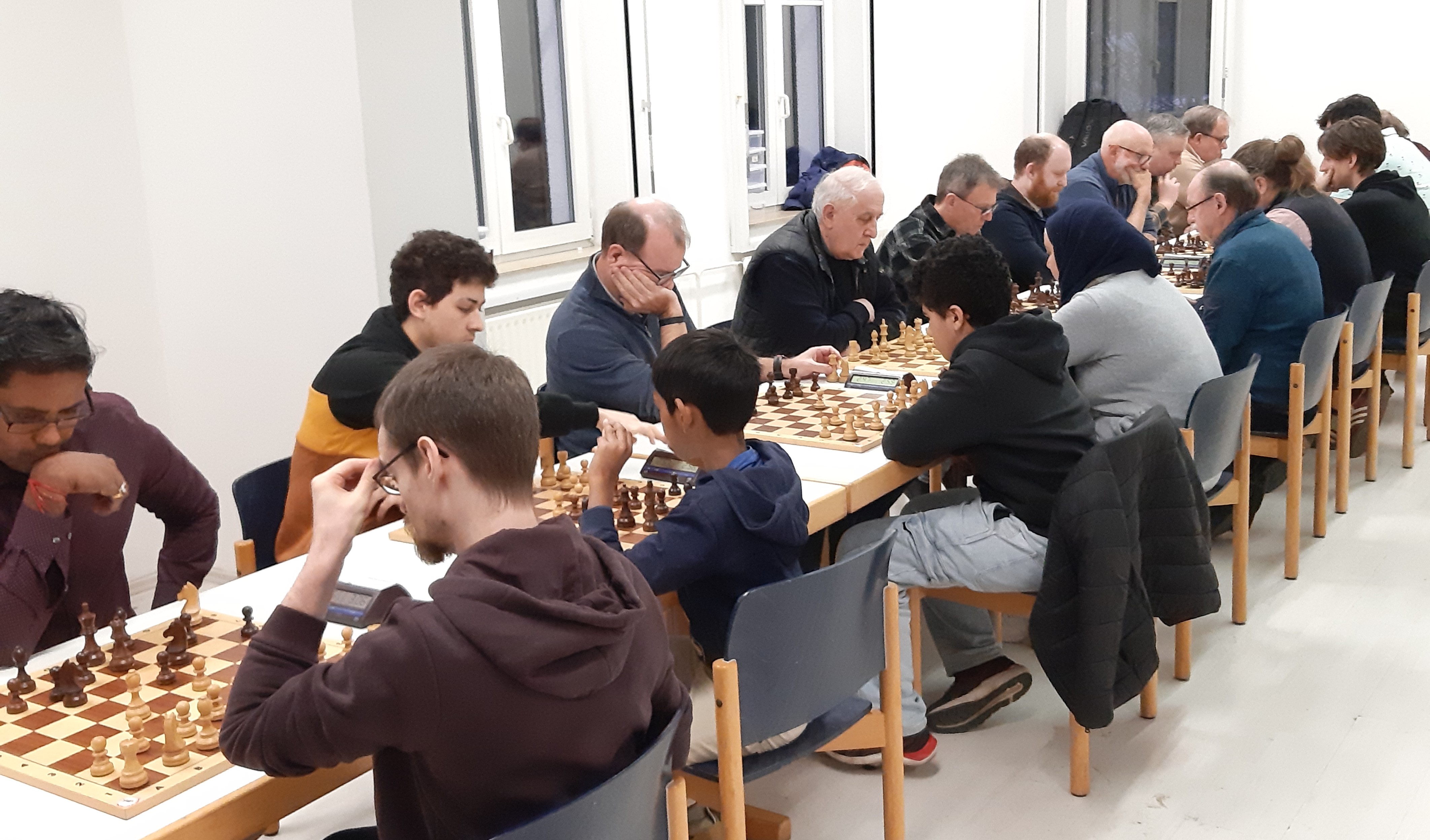 Achtzehn Schachfreundinnen und Freunde versammelten sich am 13.12.25 im "Alten Rathaus" in Würselen, dem Spiellokal der SV Würselen, um den Blitzeinzelmeister des ASVb 2025 auszuspielen. Sasha Seibt vom Aachener Schachverein gewann den Wettkampf am Ende souverän. Gegen 16 Mitkonkurrenten gewann er. Nur einmal musste er sich mit einem Remis zufrieden geben. Tim Hoffmann von Aufwärts Aachen wurde zweiter und qualifizierte sich damit ebenfalls für die Blitzeinzelmeisterschaft des Schachverbandes Mittelrhein im nächsten Jahr.