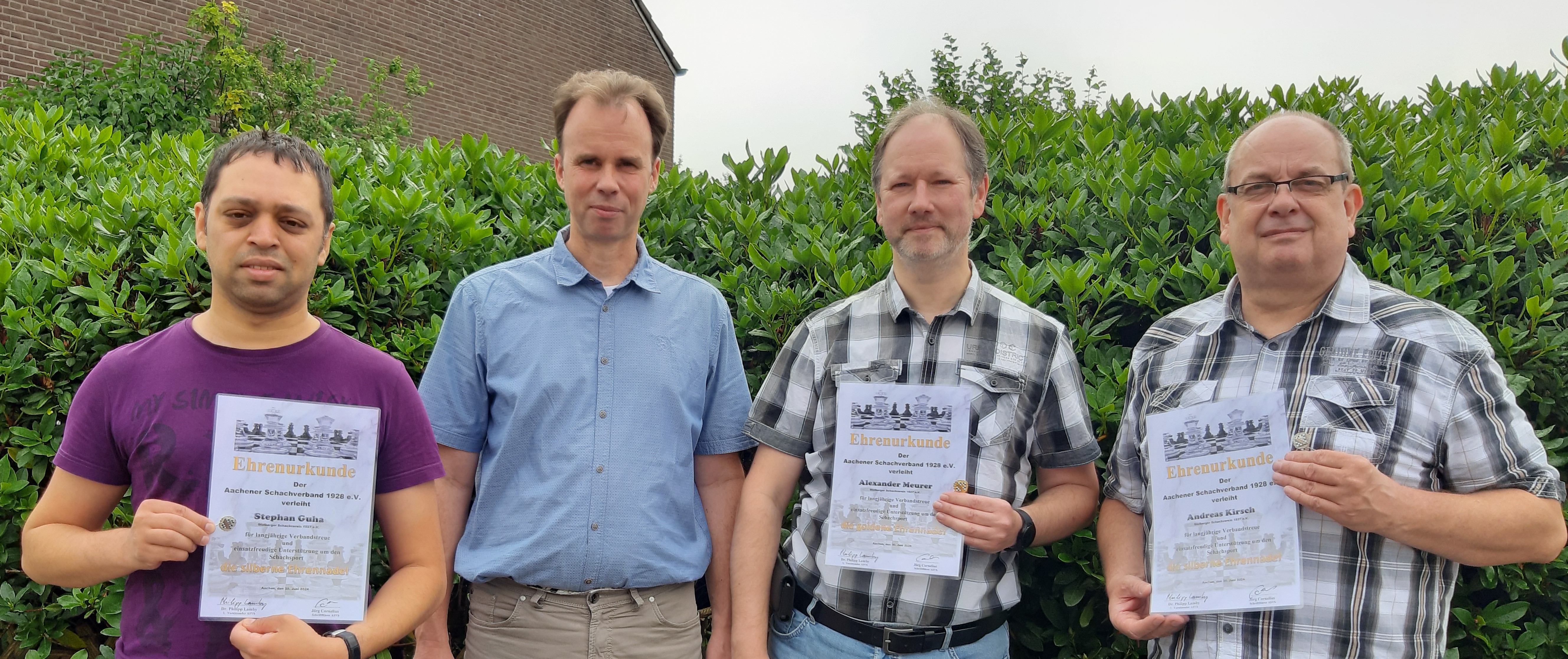 Auf der Jahreshauptversammlung des ASVb, im Spiellokal der Schachfreunde Brand, zeichnete der Vorsitzende des ASVb Dr. Philipp Lamby fünf Spieler des Stolberger Schachvereins mit Ehrennadeln aus. Die goldenen Ehrennadeln bekam Alexander Meurer für 40 jährige Mitgliedschaft und seine Verdienste als Turnierleiter und Webmaster des ASVb. Ebenfalls Golden ausgezeichnet wurde, leider in Abwesenheit Lothar Harzheim für 44 jährige Mitgliedschaft, in der er drei mal Einzelmeister (2011, 2018 und 2019) wurde. Ebenfalls in Abwesenheit ehrte die JHV Peter Preuschoff mit der silbernen Ehrennadel für mehr als 25 Jahre Mitgliedschaft und seine Verdienste als Schulschachwart von 2015 bis 2021 im Vorstand des ASVb. Andreas Kirsch wurde Silbern geehrt für 32 Jahre Mitgliedschaft. Stephan Guha bekam ebenfalls eine silberne Ehrennadel für 25 Jahre Mitgliedschaft und seine Unterstützung bei der Programmierung des ASVb Ergebnisportals.